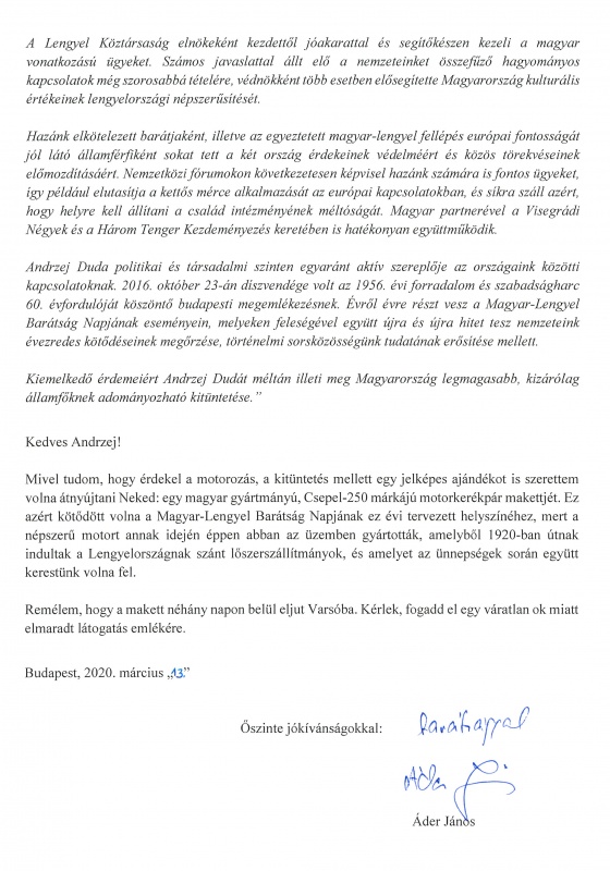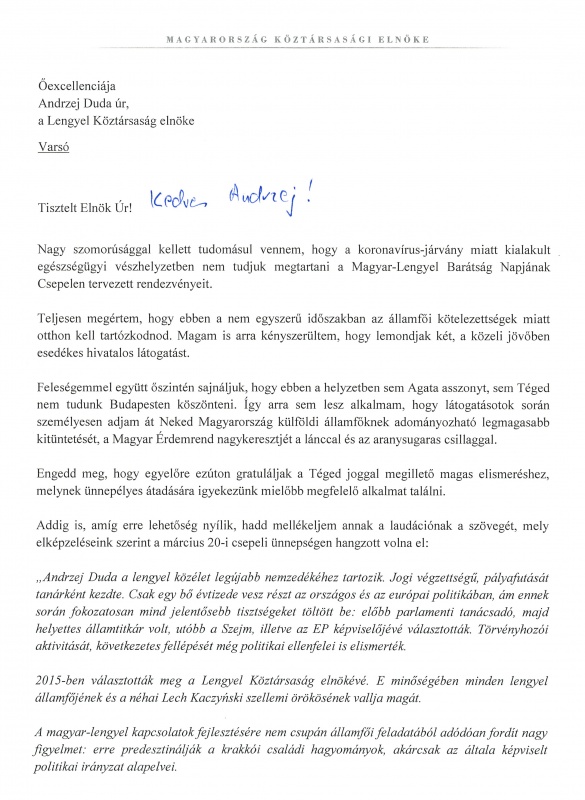 Áder János levele Andrzej Duda köztársasági elnöknek