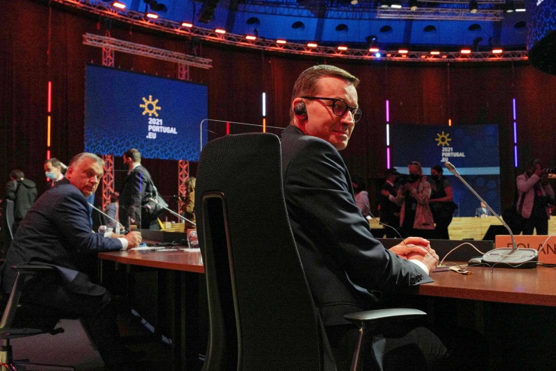 Premierzy Polski i Węgier Mateusz Morawiecki (z prawej) i Viktor Orban (z lewej) 8 maja podczas nieformalnego posiedzenia szefów państw i rządów Unii Europejskiej w Porto. Fot. Mateusz Marek / PAP
